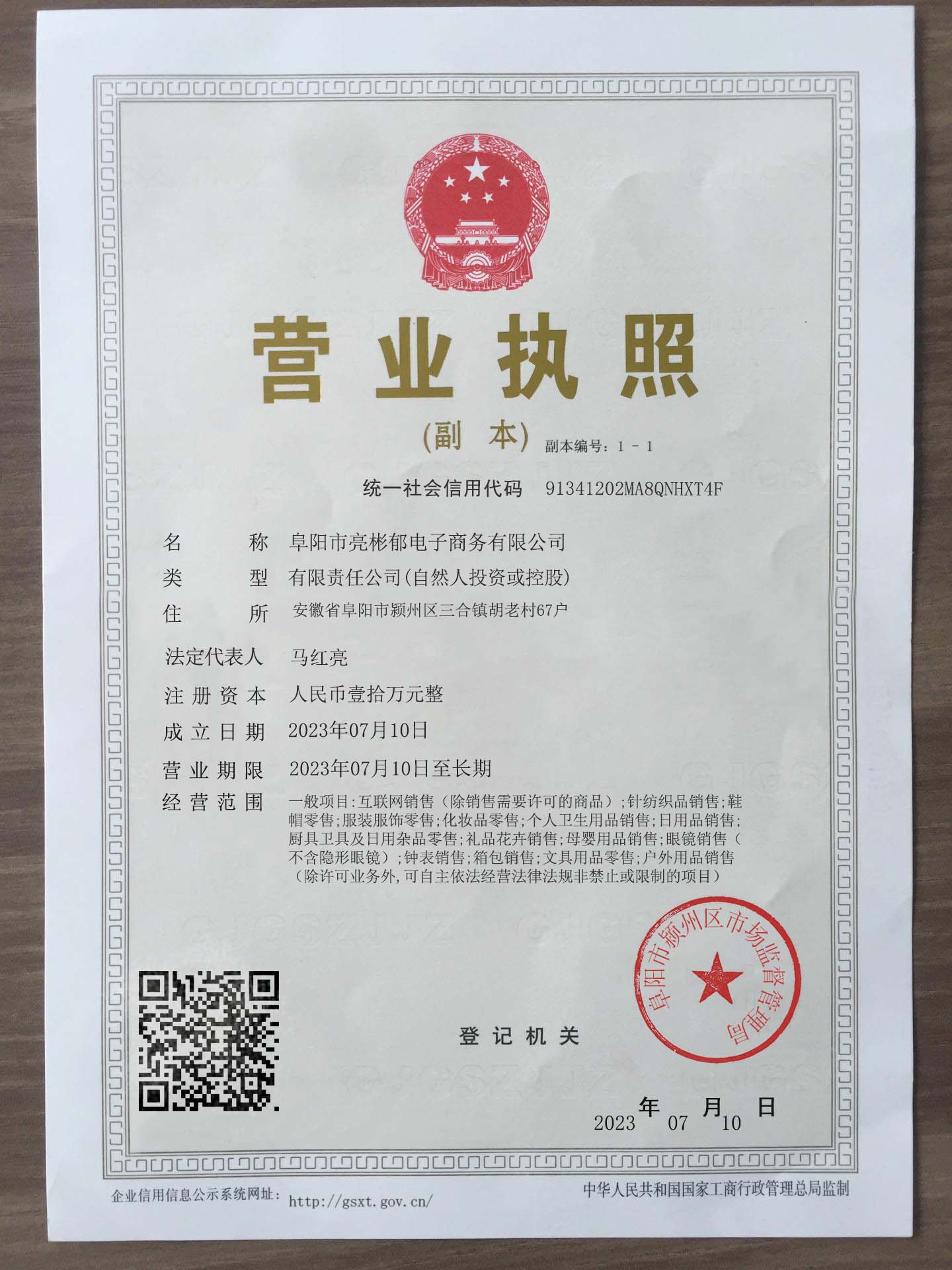 Corporate name:Fuyang Liangbinyu E-commerce Co., Ltd
